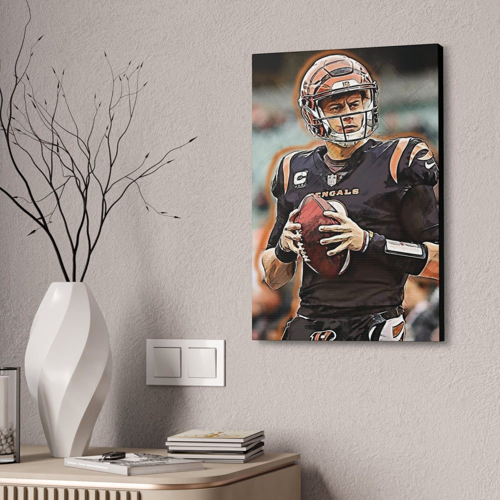 Celebrate the skill and talent of football star Joe Burrow with our stunning custom canvas. This high-quality artwork captures the essence of one of the NFLs favorite quarterbacks, making it a perfect addition for any football fan or sports enthusiast. Whether you're enhancing your living room, man cave, or office, this canvas is sure to impress and inspire.